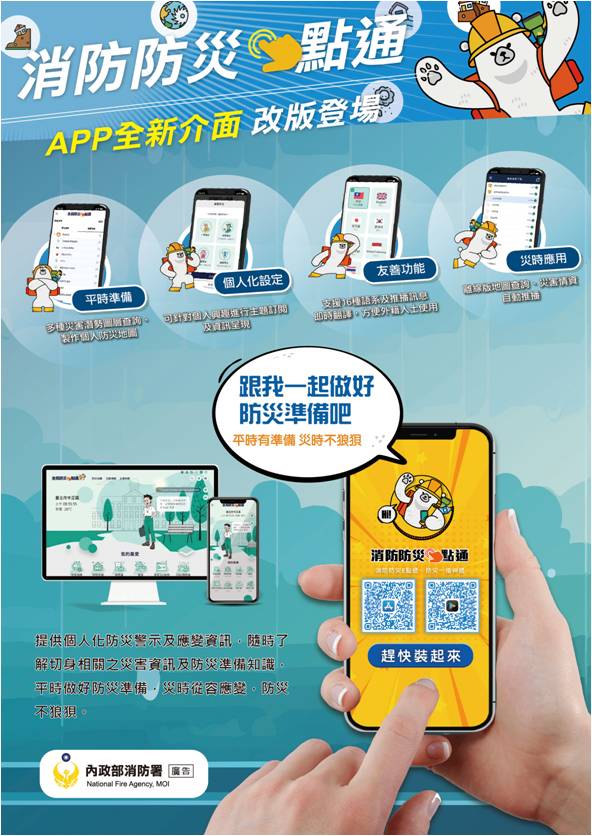 最新防災資訊、緊急避難處所位置即時掌控,立即上網搜尋「消防防災e點通」。