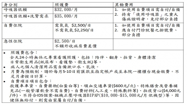 如:未經插管,但已氣切或使用非侵襲性陽壓呼吸器之呼吸器依賴患者、需洗腎但不適合住在家中之病患(本院六樓配置洗腎透析中心)