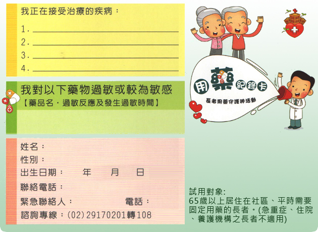 2009年財團法人醫療改革基金會對於「老人用藥安全」公布以下六項檢測: 1、覺得藥袋或藥品外包裝字太小,或看不懂正在服用的藥物到底有什麼作用或副作用。 2、有跨院、跨科就診領藥的情況。 3、除了醫生開的藥之外,同時也服用中藥或營養補給品(如維他命)。 4、忘記服藥,或是搞不清楚服藥的正確時間及用法。 5、屬於有慢性病(長期用藥)、氣喘、心臟病、藥物過敏之族群。 6、會自行停藥、加藥或減藥。 如果家中長輩符合以上任一描述,那就可能是不當或重複用藥的危險族群,特別需要做好個人用藥紀錄,並由專業醫藥人員檢查整合藥物,避免因藥物造成身體生命的傷害。  要避免老人重複用藥其實很簡單,醫改會同時提出五大「藥」訣,包括: 1、提醒醫師將用藥、過敏史,登錄在IC卡內。 2、請專業醫藥人員協助建立用藥紀錄卡。 3、就醫領藥時,主動出示用藥紀錄卡。或請醫師查閱IC卡。 4、由家庭醫師或老年整 |