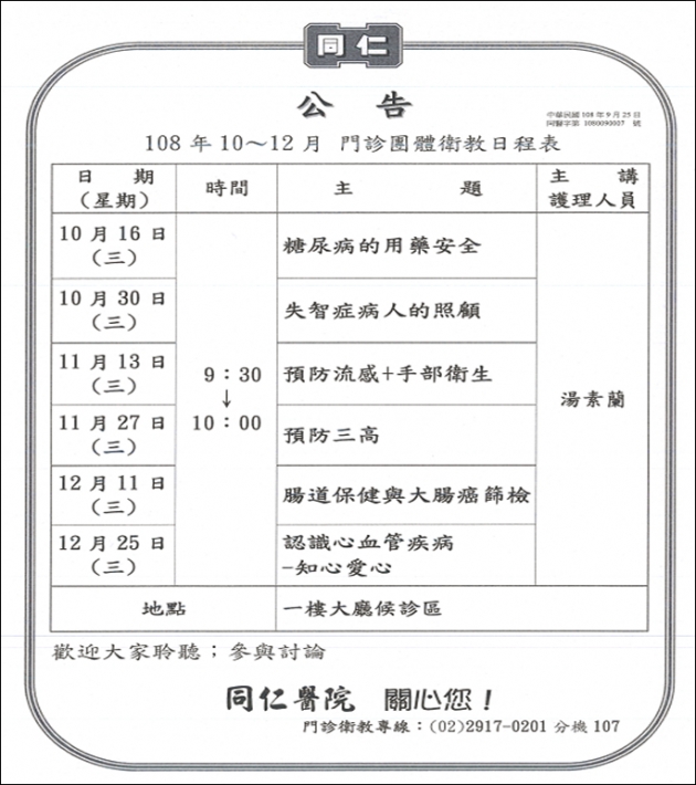 »108年10-12月門診團體衛教時間表